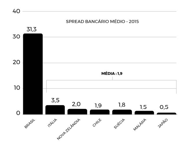 Comparando os números do Brasil na tabela 4, com os números de outros países desenvolvidos e em desenvolvimento, verifica-se a gravidade do problema. Em estudo publicado pelo Departamento de Competitividade e Tecnologia da FIESP, em fevereiro de 2017, foi apresentado um gráfico, reproduzido abaixo, mostrando que o spread bancário brasileiro em 2015 foi 16,47 vezes maior que a média de seis países, escolhidos por possuírem metodologias de cálculo semelhantes à do Brasil: Itália, Nova Zelândia, Chile, Suécia, Malásia e Japão.