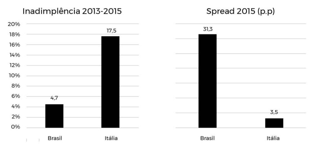 Com relação à variável inadimplência, que a partir de 2017 foi colocada como motivo principal para o nível do spread no Brasil, destaca-se que em países onde a inadimplência é maior, o spread é consideravelmente menor, como é o caso da Itália, conforme divulgado pela FIESP no citado estudo de fevereiro de 2017, com base em dados do FMI.