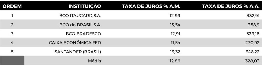 Na tabela 5, têm-se as taxas de juros para cartão de crédito rotativo, pessoa física (período: 01/09/2022 a 08/09/2022), praticadas pelos cinco maiores bancos do país. Nesse período, a taxa básica de juros anual (Selic) estava em 13,75% a.a. (valor mantido na reunião do COPOM de 21/09/2022). Os dados são absurdos. As taxas praticadas representam um verdadeiro assalto às famílias. Tecnicamente, uma transferência (forçada) de renda do trabalho para o capital. E tudo dentro do lei de um Estado que, teoricamente, defende o bem comum.